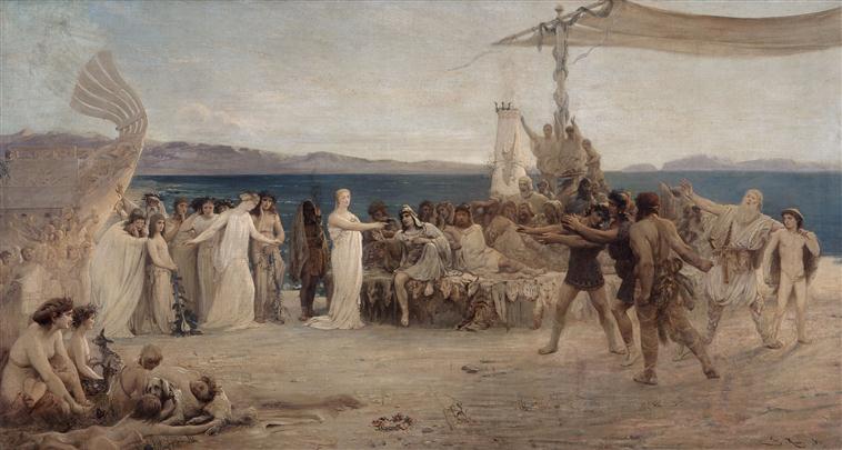 Huile sur toile. La légende de Gyptis et Protis est le mythe fondateur qui raconte la fondation légendaire de Marseille (Massalia) vers 600 av. J.-C. par des colons grecs venus de la cité de Phocée en Ionie. Exposé au Salon des artistes français, Paris, 1874