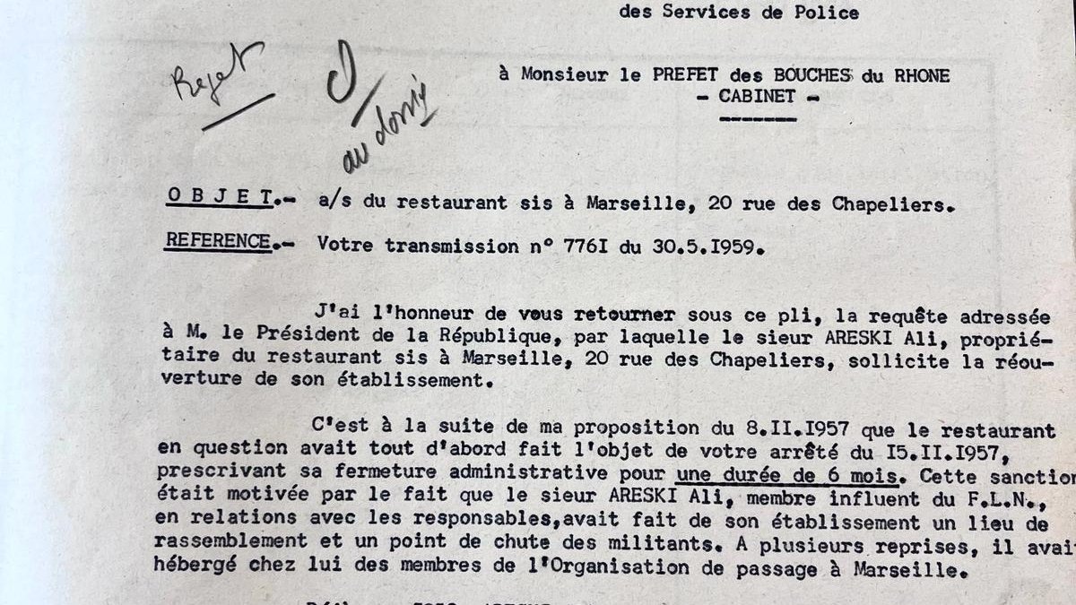 Médiathèque dossier sur la fermature du café 20 rue chapeliers :lettre du directeur departemental au prefet des bouches du Rhônes